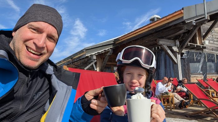 Ansonsten haben wir heute bis zum Ende die Zeit genutzt und sind bis 16:45 Uhr gefahren. Es hat wieder richtig viel Spaß gemacht. Zu Hause haben uns Sandra und Finn schon erwartet. Sie waren heute auch kurz draußen und haben an der Bar vor unserer Wohnanlage gemütlich ein Skiwasser und einen Aperol Spritz getrunken.