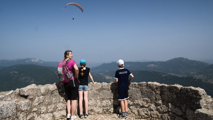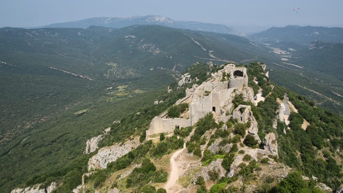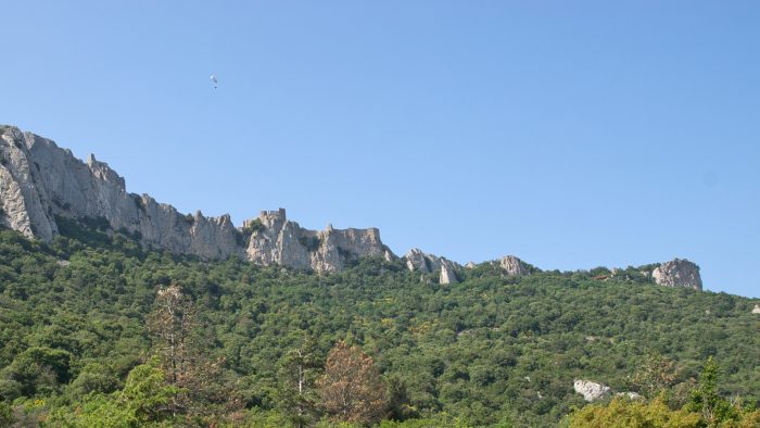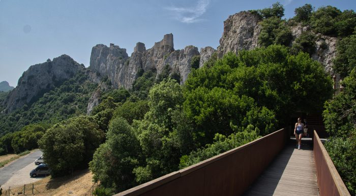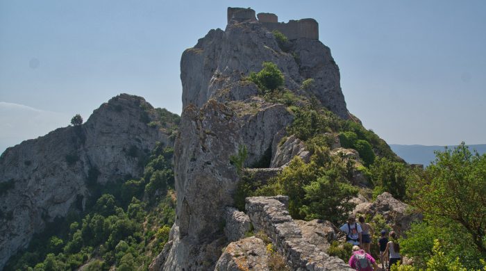 Nachdem sich alle vom Tennisspielen und Baden erholt und gestärkt hatten, ging es um 14 Uhr los in Richtung Château de Peyrepertuse. Peyrepertuse ist die Ruine einer Felsenburg und die größte Festungsanlage der Katharer im heutigen Frankreich. Sie befindet sich in der Region Okzitanien auf einem Felsen über dem Tal des Flusses Verdouble, in 800 m Höhe. Von der Ferne erkennt man die Burg fast gar nicht, so sehr verschmilzt sie mit dem Felskamm. Der Parkplatz lag kurz unterhalb der Burg. Von hier aus hieß es dann zu Fuß hinauf zur Festung. Der Zugangsweg führte uns um den Felsen herum über einen schmalen Pfad hin zum Eingang der Burg.