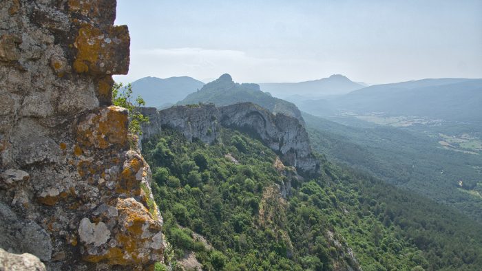 Die alte Festungsanlage ist wirklich faszinierend. Die steilen Außenmauern verschmelzen förmlich mit den Felsen und werden so noch steiler. In der Burganlage konnten wir frei herumlaufen. In der Ferne konnten wir eine andere wichtige Burg – Château de Quéribus – erblicken. Diese beiden Burgen, Peyrepertuse und Quéribus, sind die einzigen beiden in der Region, die sich im Blickfeld haben und früher miteinander kommunizieren konnten. Zu Zweit wachten sie über die ganze Region, vom Meer bis zu den Pyrenäen. Jeder Staub, der von Feinden aufgewirbelt wurde, wurde sofort entdeckt. Dank des dichten Netzwerkes an Burgen in der Region, von denen wir ja auch schon einige besichtigt haben, wurde berechnet, dass früher eine Nachricht nur drei Stunden brauchte, um bei der Sénéchaussée von Carcassonne anzukommen.