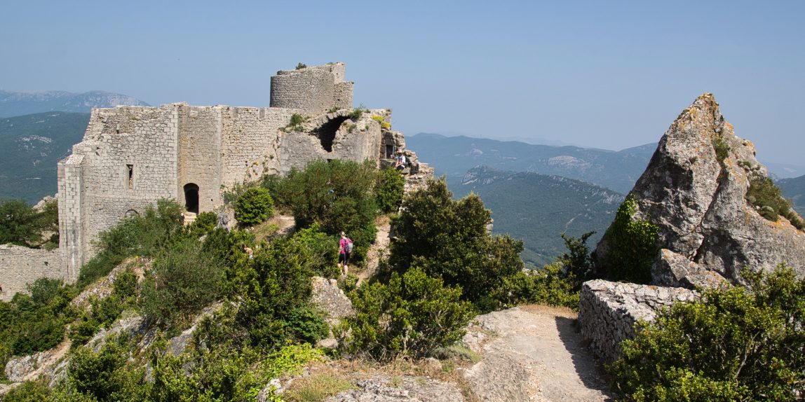 Nachdem sich alle vom Tennisspielen und Baden erholt und gestärkt hatten, ging es um 14 Uhr los in Richtung Château de Peyrepertuse. Peyrepertuse ist die Ruine einer Felsenburg und die größte Festungsanlage der Katharer im heutigen Frankreich. Sie befindet sich in der Region Okzitanien auf einem Felsen über dem Tal des Flusses Verdouble, in 800 m Höhe. Von der Ferne erkennt man die Burg fast gar nicht, so sehr verschmilzt sie mit dem Felskamm. Der Parkplatz lag kurz unterhalb der Burg. Von hier aus hieß es dann zu Fuß hinauf zur Festung. Der Zugangsweg führte uns um den Felsen herum über einen schmalen Pfad hin zum Eingang der Burg.