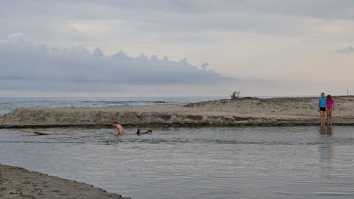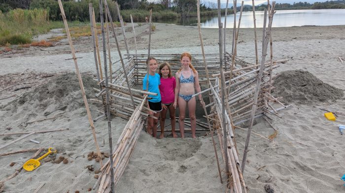 Die Mädchen haben wieder fleißig an ihrem Strandhaus gebaut, das immer beeindruckendere Formen annimmt. Da wir heute das SUP am Mobilehome gelassen hatte, musste sich Finn Baumstämme suchen, um im Wasser zu planschen.