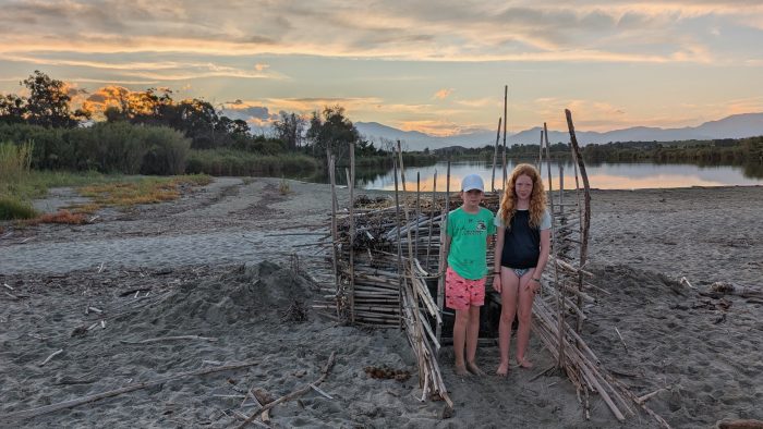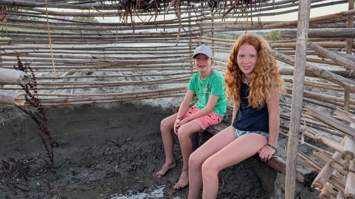 Nun konnten es die Mädchen aber kaum noch aushalten endlich zu ihrem Strandhaus zu kommen, da sie unbedingt noch das Haus fertigstellen wollten. Den Rest des Nachmittags haben wir also wieder am Strand verbracht. Und tatsächlich, am Ende stand ein am Strand ein 1A-Bambushaus sogar mit Dach und einer Sitzbank. Klasse.