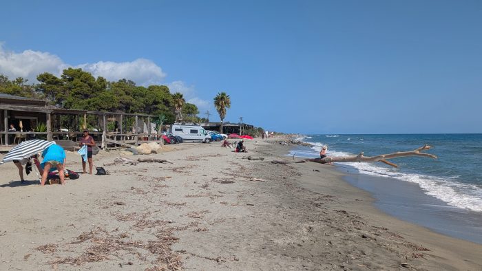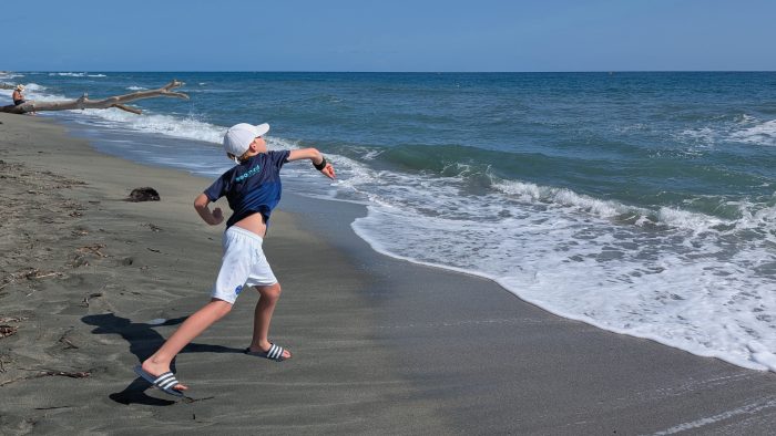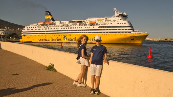 Der Wecker klingelte heute früh und nach einem schnellen Frühstück mussten wir Taschen packen, alles im Auto verstauen und das Mobilehome sauber machen. Etwas verspätet konnten wir die Schlüssel um ca. 11:30 Uhr an der Rezeption des Campingplatzes abgeben. Bevor wir uns mit den zwei Autos – wir müssen ja das Auto der Thiers auch zurückfahren – auf den Weg nach Bastia gemacht machen, wollten wir noch einmal zum Meer laufen, um uns zu verabschieden. Außerdem wollte Finn unbedingt seinen verlorenen Milchzahn ins Meer schmeißen, so wie es Amelie auch im Pfingsturlaub in Südfrankreich gemacht hatte.